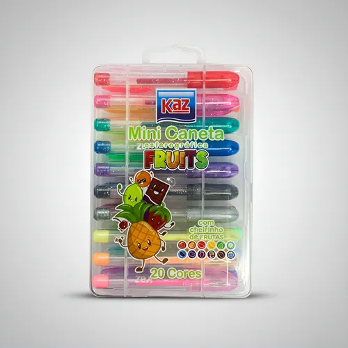 Deixe suas anotações mais criativas e perfumadas com a Mini Caneta Esferográfica Fruits Kaz. São 20 cores, sendo 7 com glitter, 7 neon e 6 tons pastel, que trazem brilho, cor e diversão para o seu dia a dia.